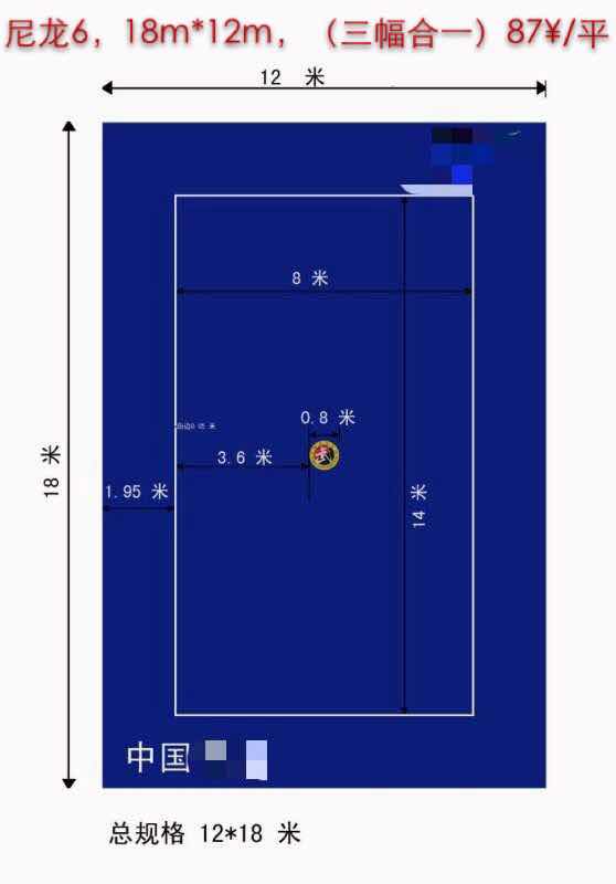 武術地毯:材質采用純進口尼龍六、紗羅布、背膠,規格采用國際標準三幅合一12米*18米,絨高0.8cm,克重量1100克/平,各種顏色都可訂做,出廠價107元/平。