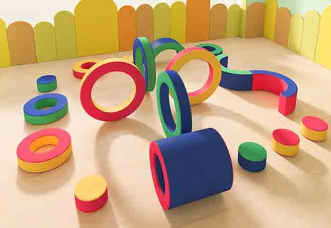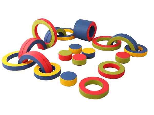 軟體器材彩虹接龍19件套裝:大圓4個90X90X15cm、小圓4個62X62X15cm、半圓4個90X45X30cm、圓凳6個直徑32cm高20cm,圓桶1個直徑62cm高60cm